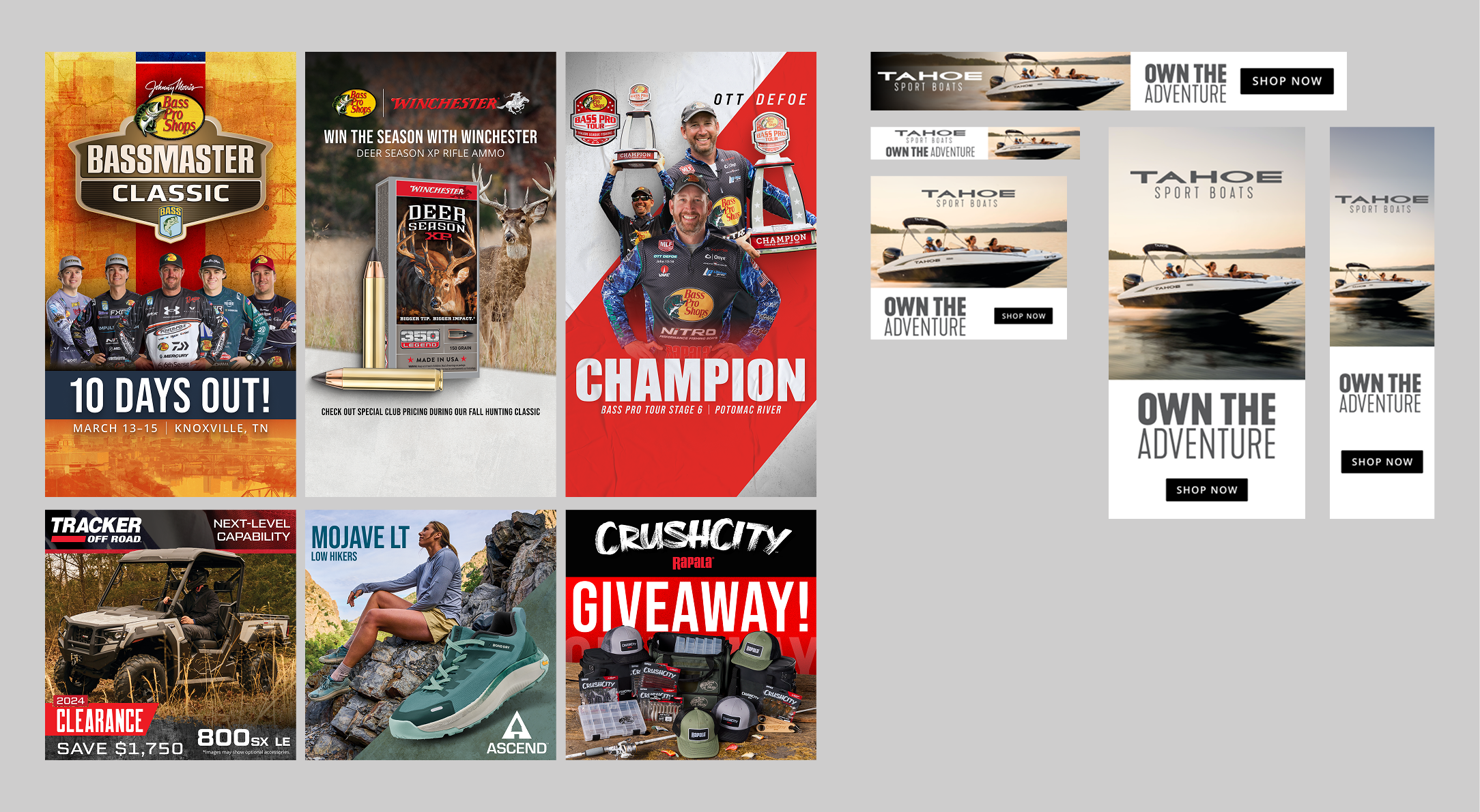 As a Digital Creative Designer at Bass Pro Shops, I delivered efficient, high-quality design solutions within a fast-paced environment while maintaining strong cross-functional communication. In this role, I collaborated with a range of stakeholders, including White River Marine Group, Cabela's, Bass Pro Shops’ proprietary brands, Bass Pro Partners, and NASCAR.
